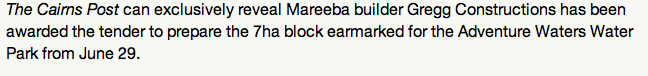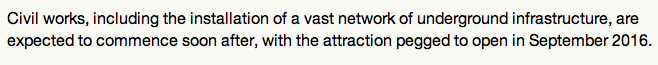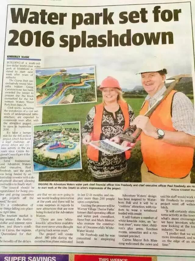 这个投资4千5百万澳元的水上公园,占地7公顷,将会雇用超过340个工作机会,估计2016年底完成,就在即将要新建的南半球最大的赌场旁边。